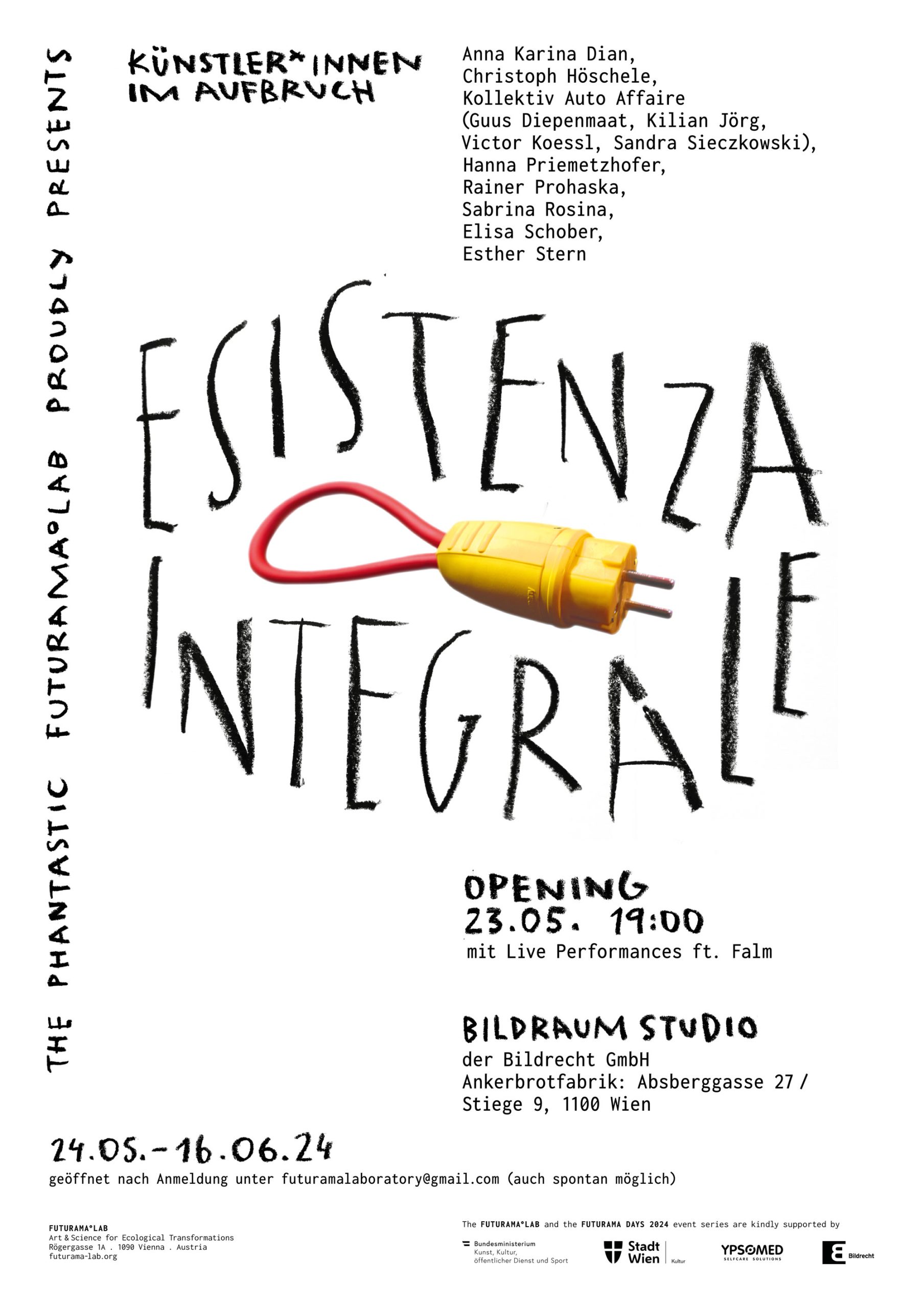 Poster and floorplan for the FUTURAMA°LAB group exhibition ESISTENZA INTEGRALE